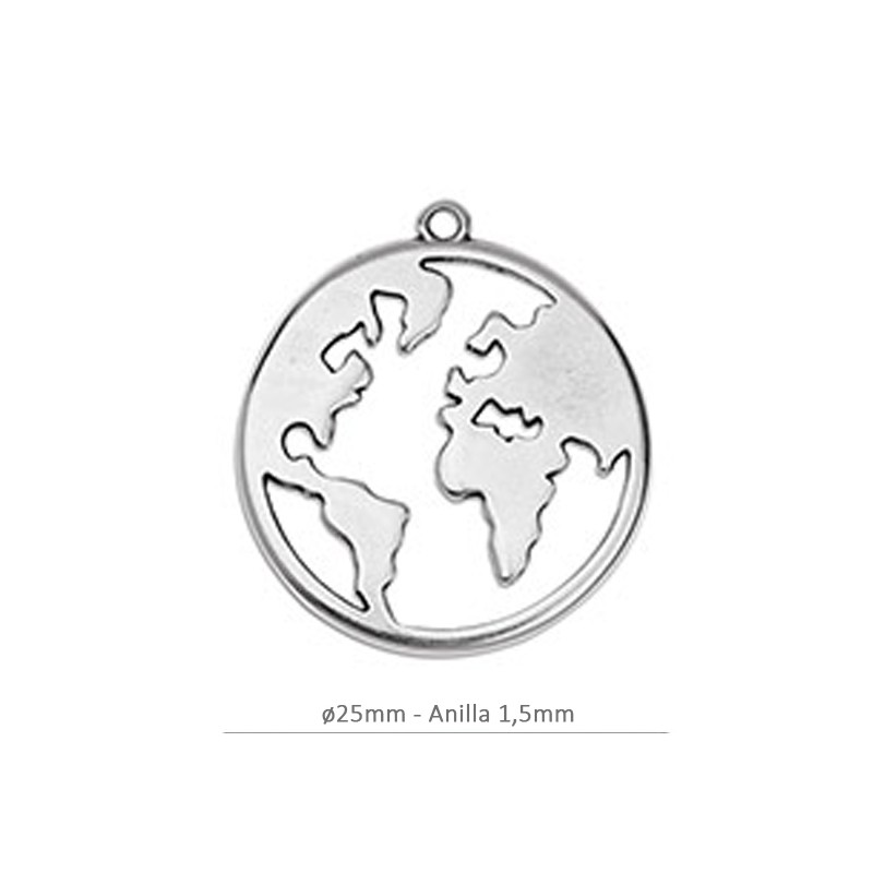 Pendentif monde de zamac baigné d’argent. 25 mm de diamètre, bague 1,5 mm Le prix est par unité.