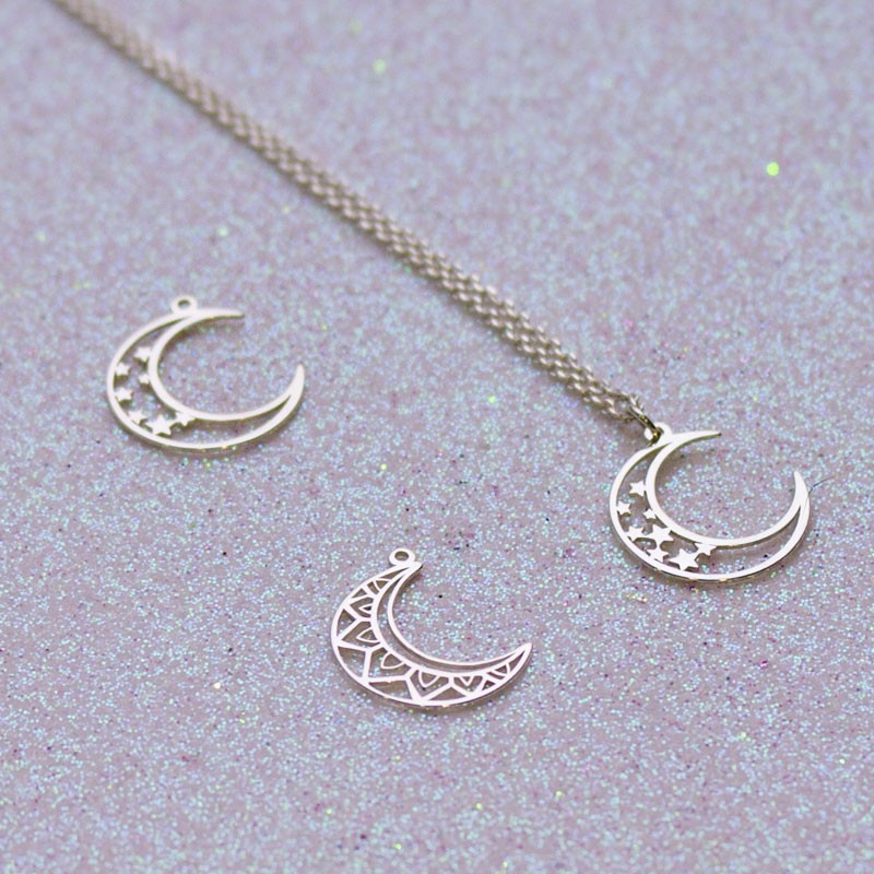 - Pendentif lunaire avec étoiles en argent 925. - La taille est de 15 millimètres et la perceuse supérieure de 1 millimètre. - Le prix est par sac et le sac contient une unité.