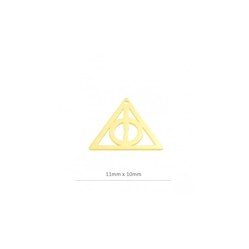 - Pendentif symbole Reliques de la Mort (Harry Potter) en argent 925 avec placage d’or. - La taille est de 11 mm (longueur) et 10 millimètres (largeur). - Le prix est par sac et le sac contient une unité.