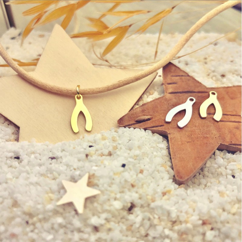 - Pendentif symbole d’os de souhait en argent 925 avec placage d’or. - La taille est de 13 millimètres et le haut de 1 millimètre. - Le prix est par sac et le sac contient une unité.