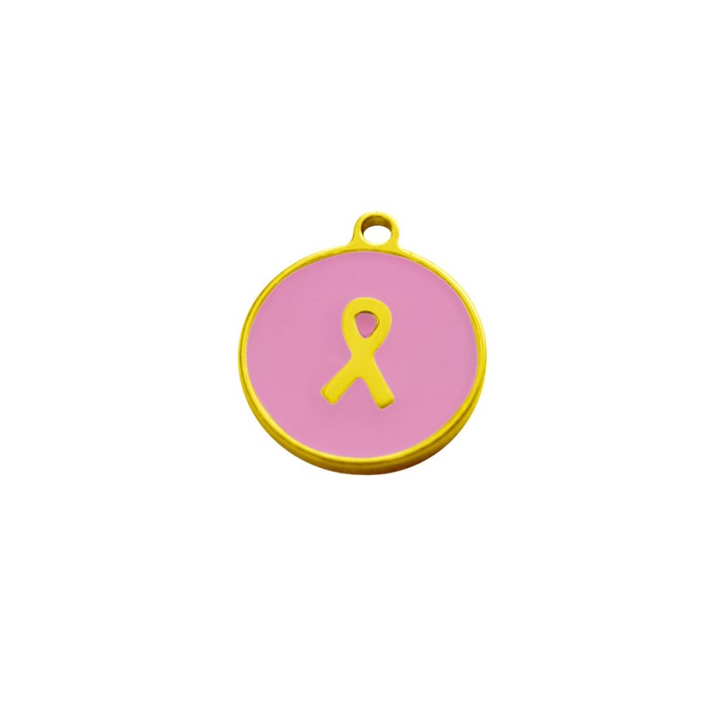 Pendentif rond à arc anticancéreux en argent 925, baigné d’or 18 carats et émaillé de rose. Fabriqué en Espagne.