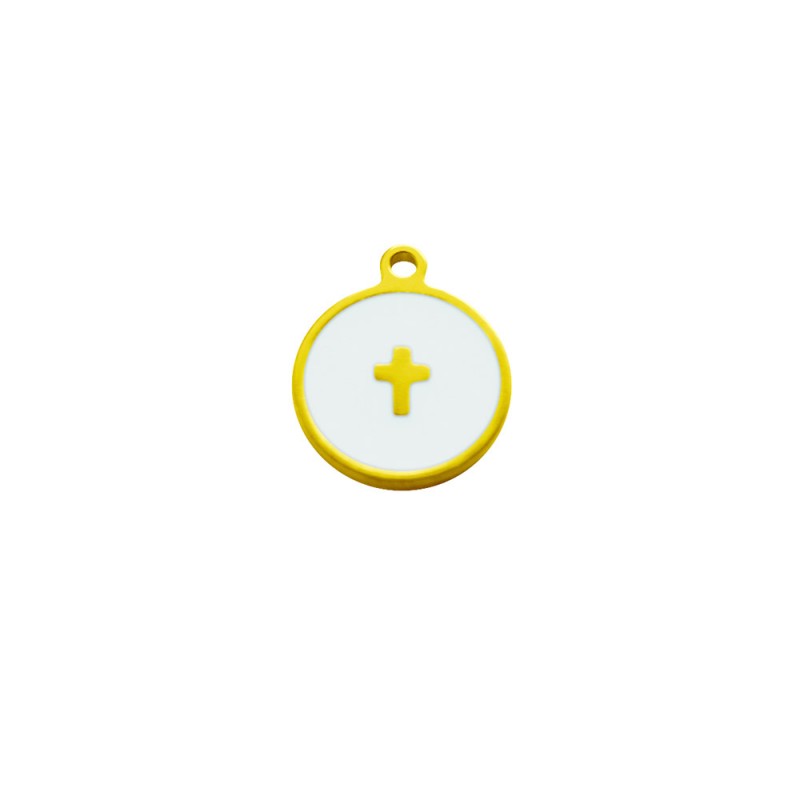 Pendentif rond en croix en argent 925, baigné d’or 18 carats et émaillé de blanc. Fabriqué en Espagne.