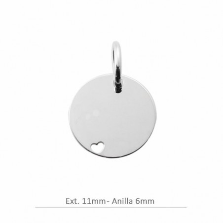 Pendentif rond en tôle avec un mini cœur ajouré à graver en argent 925, fabriqué en Espagne. Il est livré avec un anneau soudé également argent 925. C’est la petite taille des plaques de gravure qui est disponible.