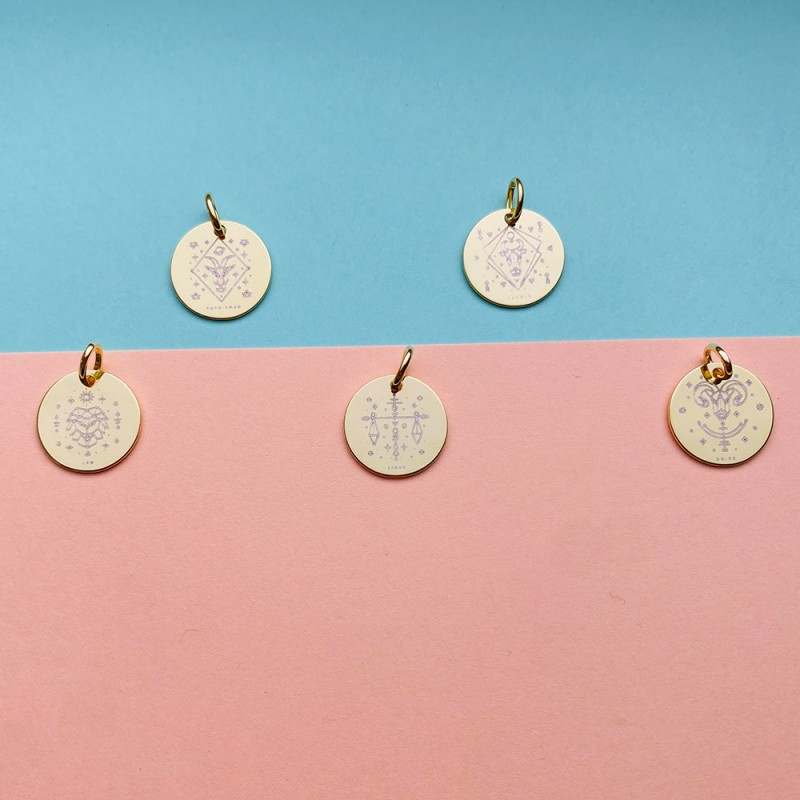 Pendentif rond de l’horoscope du Cancer en argent 925, baigné d’or 18 carats et gravé en blanc avec le symbole du Cancer. Fabriqué en Espagne.