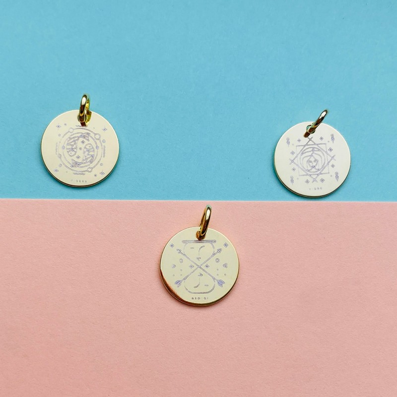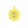 Pendentif rond de l’horoscope de la Vierge en argent 925, baigné d’or 18 carats et gravé en blanc avec le symbole de la Vierge. Fabriqué en Espagne.