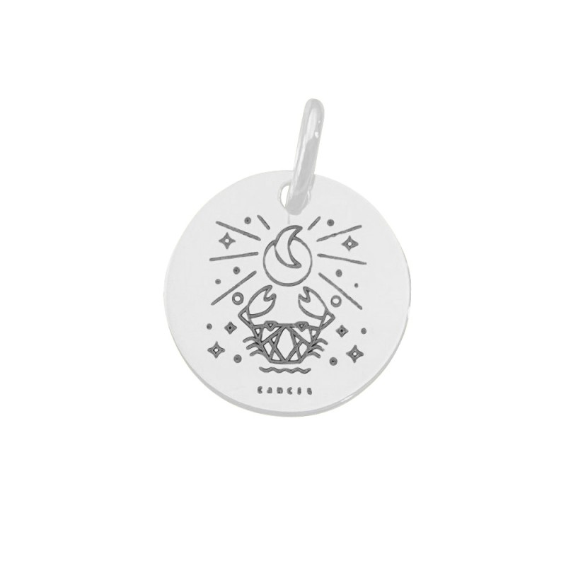 Horoscope du Cancer pendant rond en argent 925 et gravé en blanc avec le symbole du Cancer. Fabriqué en Espagne.