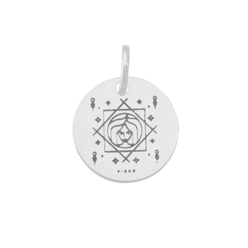 Pendentif d’horoscope rond de la Vierge en argent 925 et gravé en blanc avec le symbole de la Vierge. Fabriqué en Espagne.