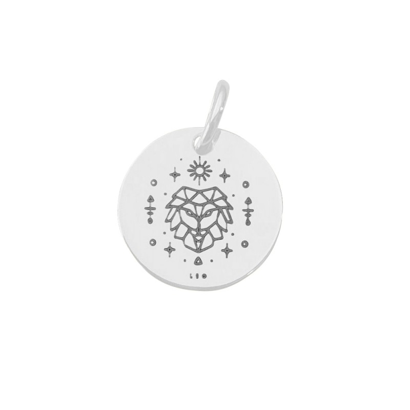 Pendentif horoscope lion rond en argent 925 et gravé en blanc avec le symbole du Lion. Fabriqué en Espagne.