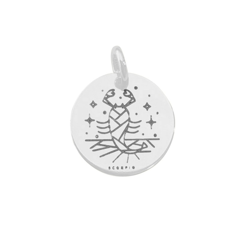 Pendentif d’horoscope rond du Scorpion en argent 925 et gravé en blanc avec le symbole du Scorpion. Fabriqué en Espagne.