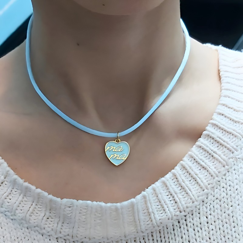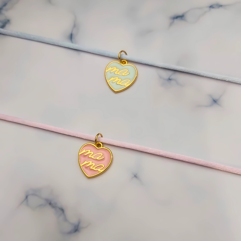 Pendentif coeur maman émaillé bleu. Zamak avec placage en or 24 carats.