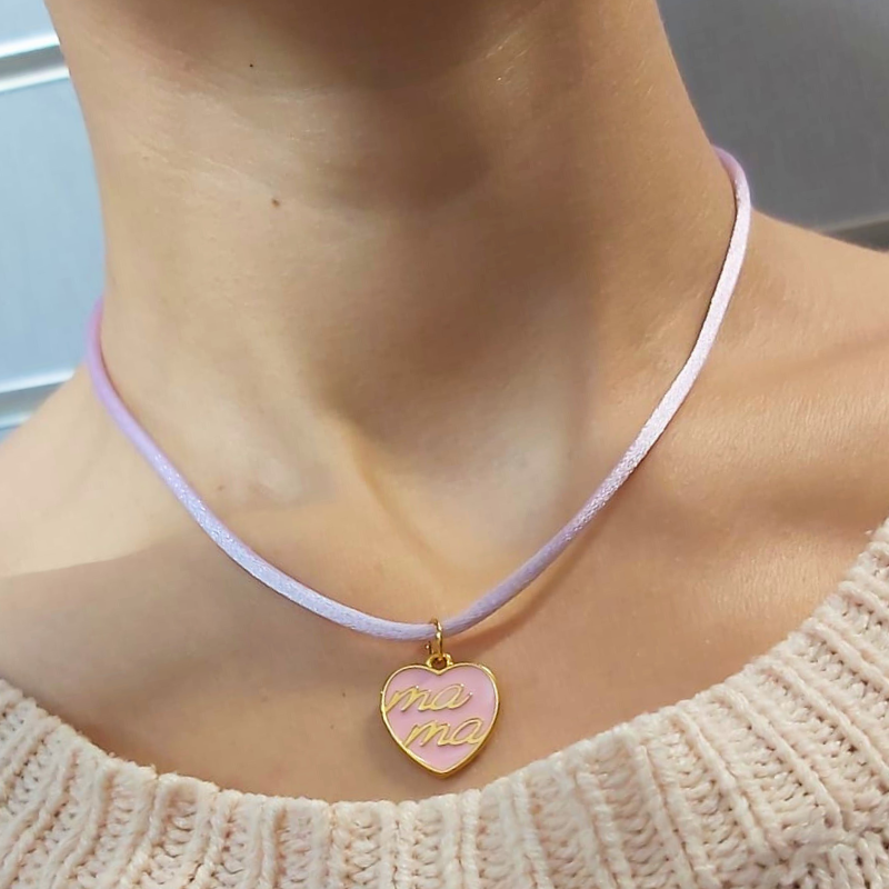 Pendentif coeur maman émaillé rose. Zamak avec placage en or 24 carats.