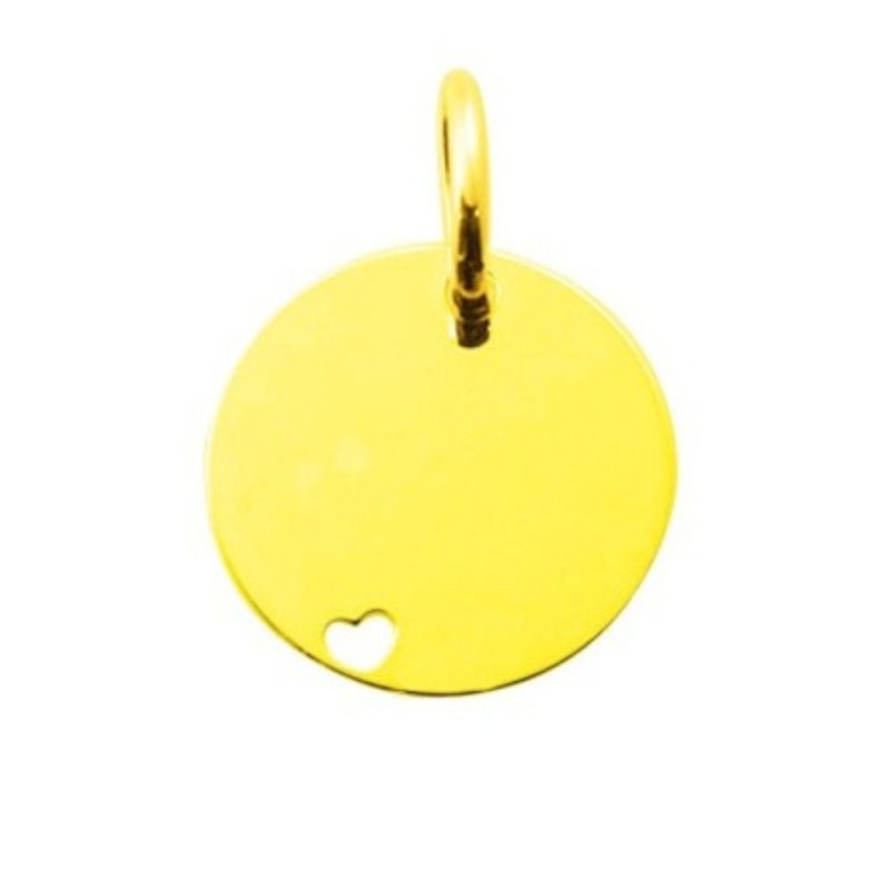Pendentif rond à graver avec coeur sur argent 925 baigné d’or 18 carats, fabriqué en Espagne. Il est livré avec un anneau soudé. C’est la moyen taille des plaques de gravure qui est disponible.