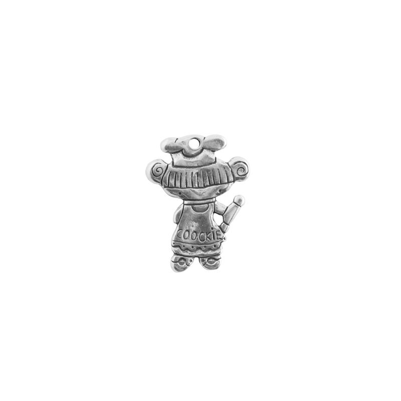 Poupée suspendue lola cuisiner de petite taille dans zamac avec argenté. Le sac contient 1 unité. La taille est de 40x33 mm. et la perceuse est de 3,5 mm.
