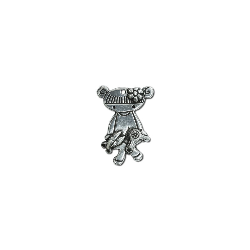Poupée suspendue lola coiffeur de petite taille dans zamac avec argenté. Le sac contient 1 unité. La taille est de 40x33 mm. et la perceuse est de 3 mm.