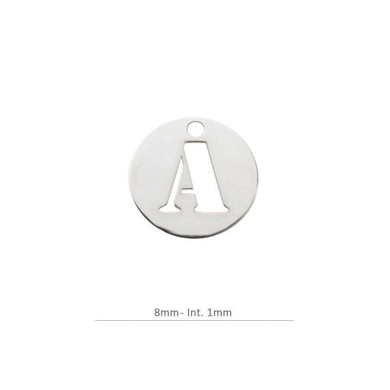 Pendentif Rond Charm lettre A. 8 mm avec perceuse 1,2 mm