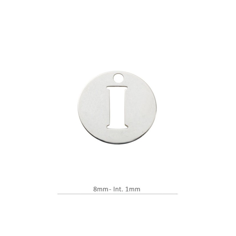 Pendentif Rond Charm lettre I. 8 mm avec perceuse 1,2 mm
