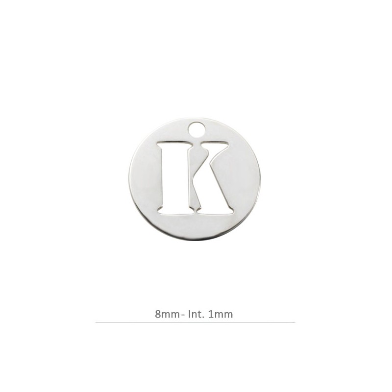 Pendentif Rond Charm lettre K. 8 mm avec perceuse 1,2 mm