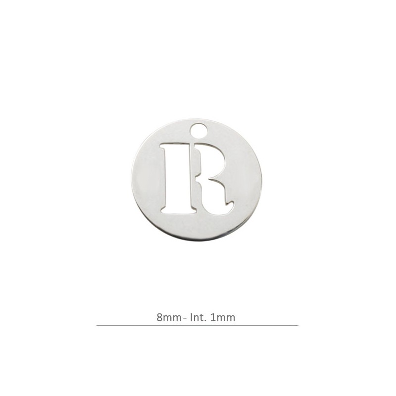 Pendentif Rond Charm lettre R. 8 mm avec perceuse 1,2 mm