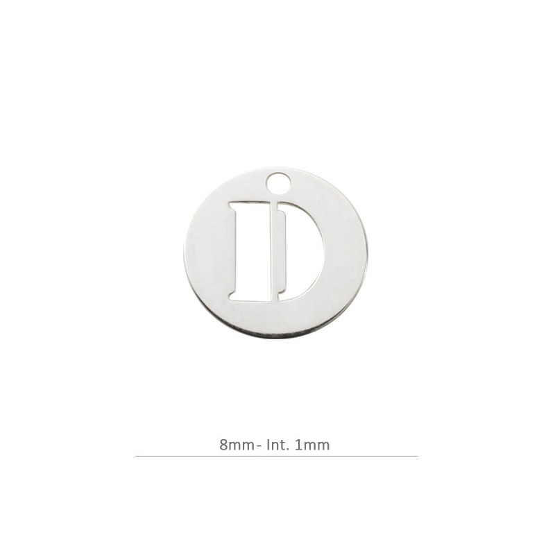 Pendentif Rond Charm lettre D. 8 mm avec perceuse 1,2 mm