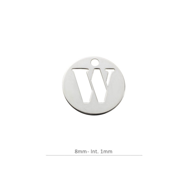 Pendentif Rond Charm lettre W. 8 mm avec perceuse 1,2 mm
