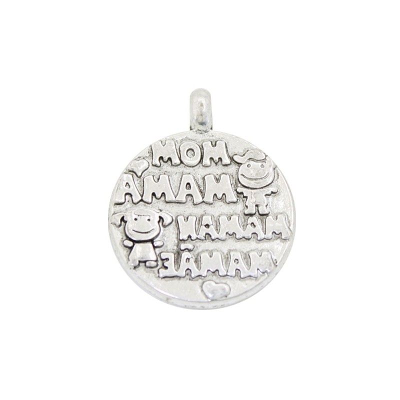 - Colgantemamá en zamac avec argenté. - La taille est de 23 millimètres et la perceuse est de 2,5 millimètres. - Le prix est par unité.