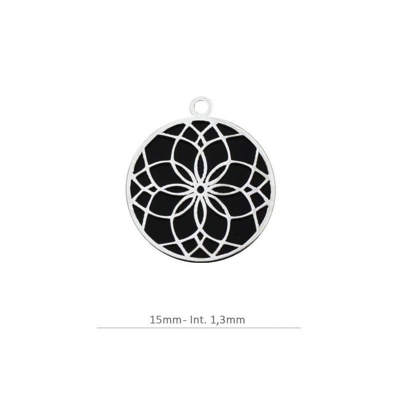 - Petit pendentif avec motif mandala en argent 925. - La taille est de 15 millimètres et a un anneau avec un intérieur de 1,3 millimètres. - Le prix est par sac et le sac contient 1 unité. - Le méthacrylate noir est uniquement une exposition et n’est pas inclus, le prix ne correspond qu’à la pièce d’argent.