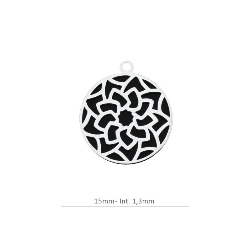 - Petit pendentif avec motif mandala en argent 925. - La taille est de 15 millimètres et a un anneau avec un intérieur de 1,3 millimètres. - Le prix est par sac et le sac contient 1 unité. - Le méthacrylate noir est uniquement une exposition et n’est pas inclus, le prix ne correspond qu’à la pièce d’argent.