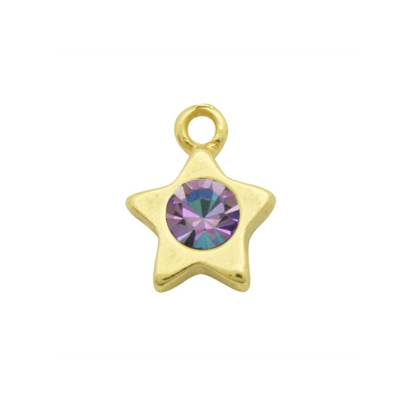 - Pendentif en étoile avec cristal dans zamac avec bain d’or. - Deux cristaux sont inclus qui viennent sans coller à la base. - La taille est de 12 millimètres. - Le prix est par sac et le sac contient 2 unités.