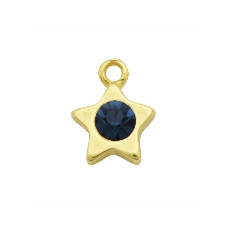 - Pendentif en étoile avec cristal dans zamac avec bain d’or. - Deux cristaux sont inclus qui viennent sans coller à la base. - La taille est de 12 millimètres. - Le prix est par sac et le sac contient 2 unités.