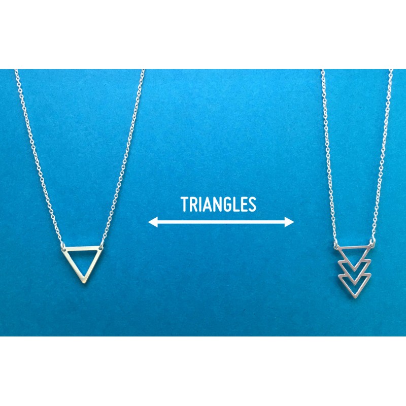 - Il interjédise trois triangles en argent 925. - Hauteur 14mm et largeur 5mm. 2 anneaux. - Le prix est par sac.
