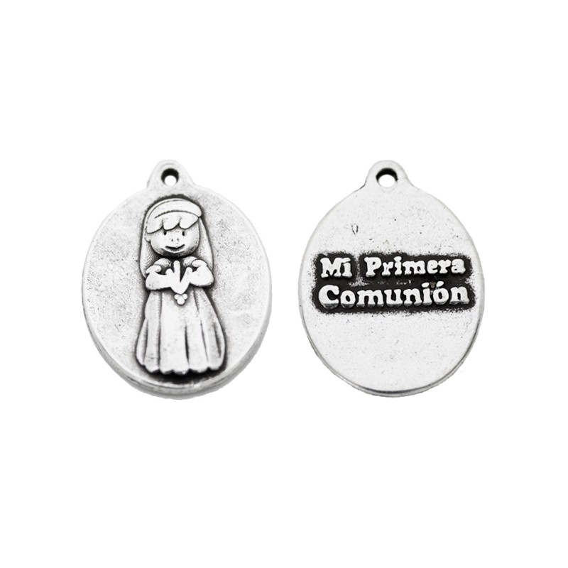 - Pendentif médaille de communion de fille dans zamac argenté. - Taille: 25x18mm 2mm trou. - Le prix est par unité.