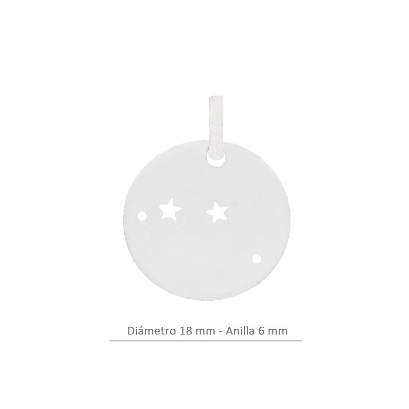 Pendentif en argent 925 avec signes du zodiaque en tôle. Diamètre 18 mm. Il a un anneau de 6 mm. Vendu à l’unité.