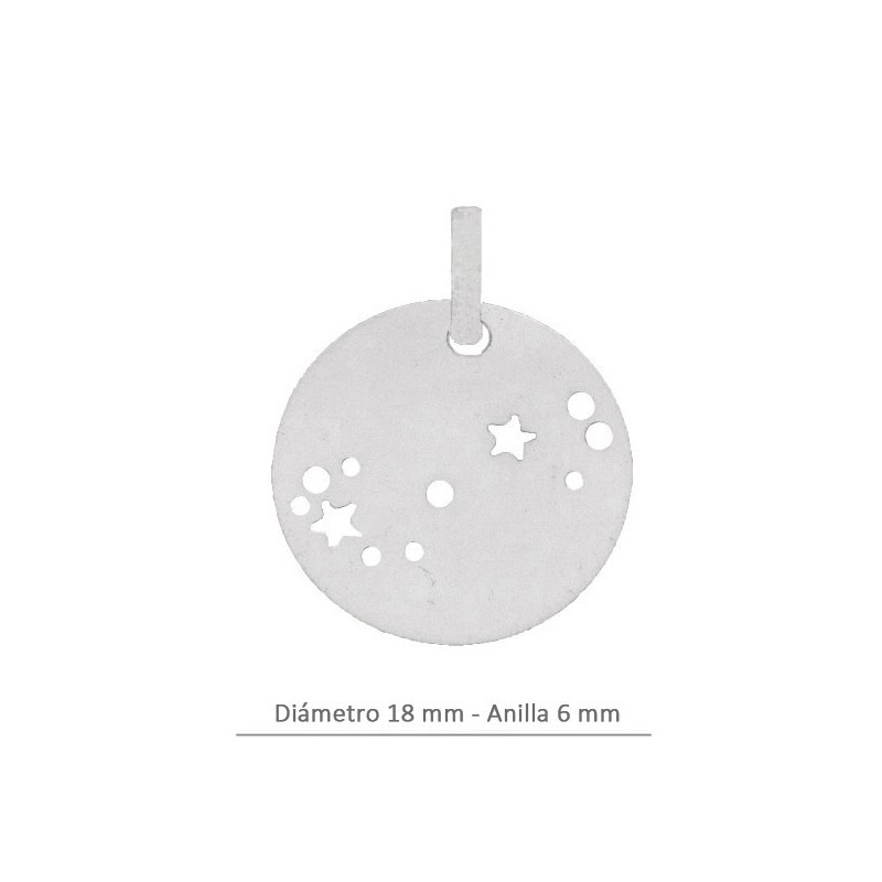 Pendentif en argent 925 avec signes du zodiaque en tôle. Diamètre 18 mm. Il a un anneau de 6 mm. Vendu à l’unité.