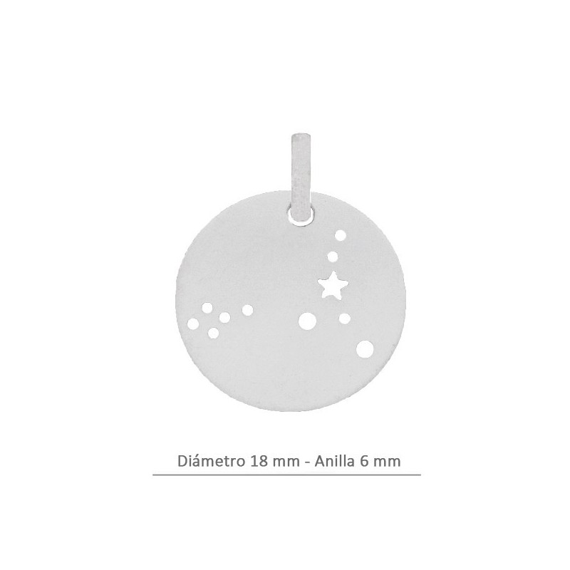 Pendentif en argent 925 avec signes du zodiaque en tôle. Diamètre 18 mm. Il a un anneau de 6 mm. Vendu à l’unité.