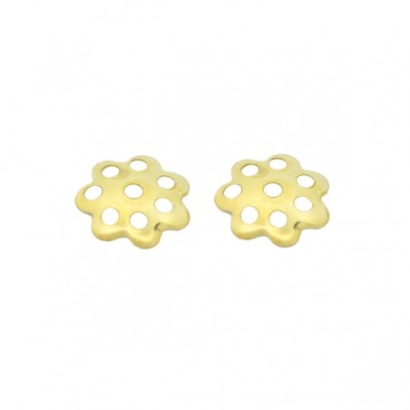 - Coupelles fleur de laiton de couleur dorée. - La taille est de 5 millimètres et a une perceuse de 1 millimètre. - Le prix est par sac et le sac contient 10 unités.