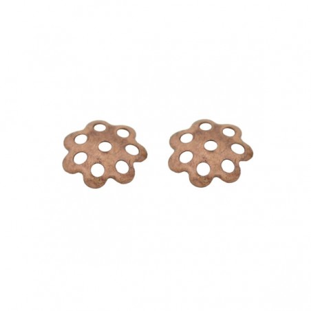 - Coupelles fleur de laiton de couleur dorée. - La taille est de 5 millimètres et a une perceuse de 1 millimètre. - Le prix est par sac et le sac contient 10 unités.