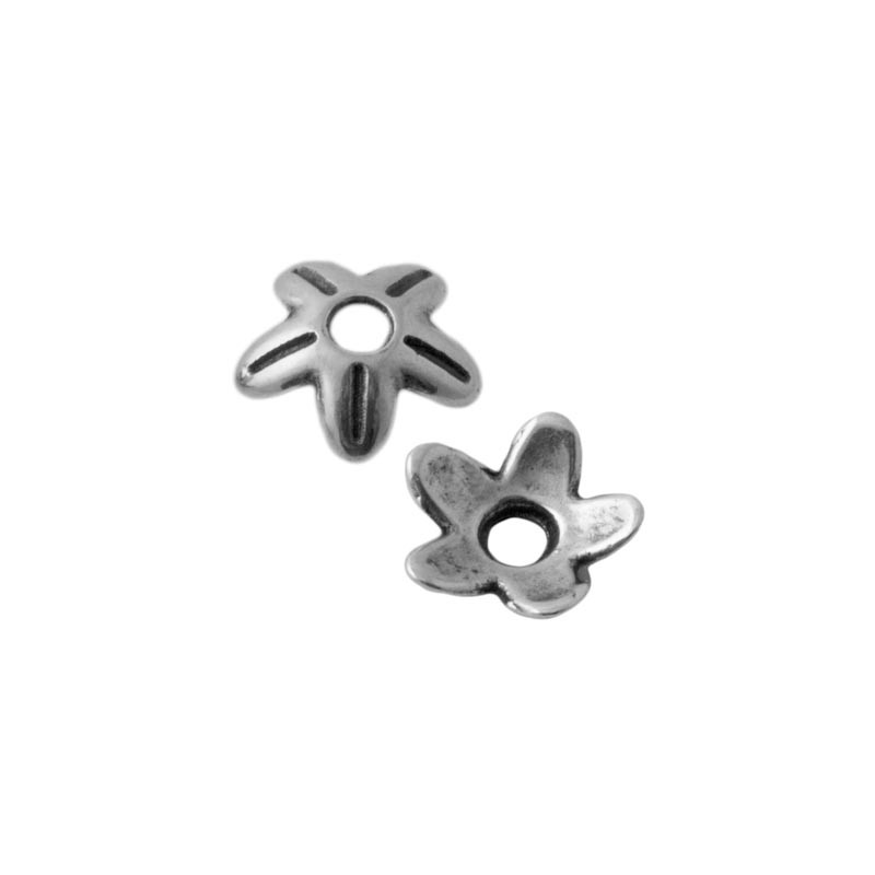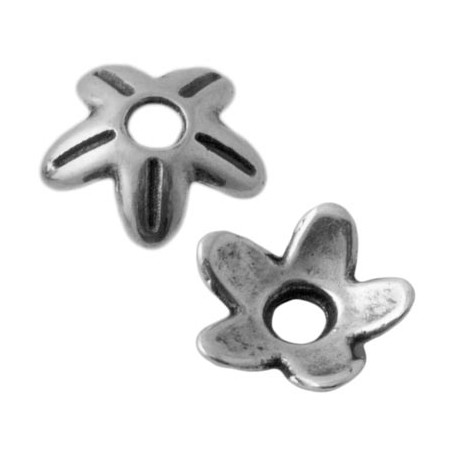 Coupelles fleur en zamac avec argenté. Le sac contient 2 unités. La taille est de 9 mm. et la perceuse est de 2 mm.