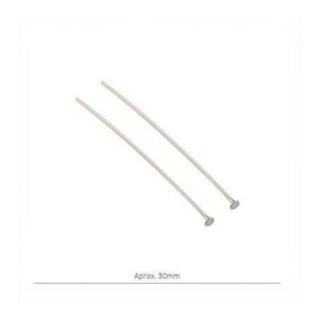 - Épingle avec butée plate en laiton de couleur argent. - La taille est d’environ 30 millimètres et le dessus est de 3 millimètres. - Le prix est par sac et le sac contient 50 unités.