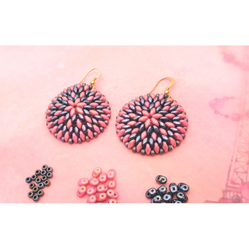 Profitez de la création de vos boucles d’oreilles avec les perles superduo dans les tons rose et hématite! Vous pouvez également créer le bracelet assorti pour vous-même.