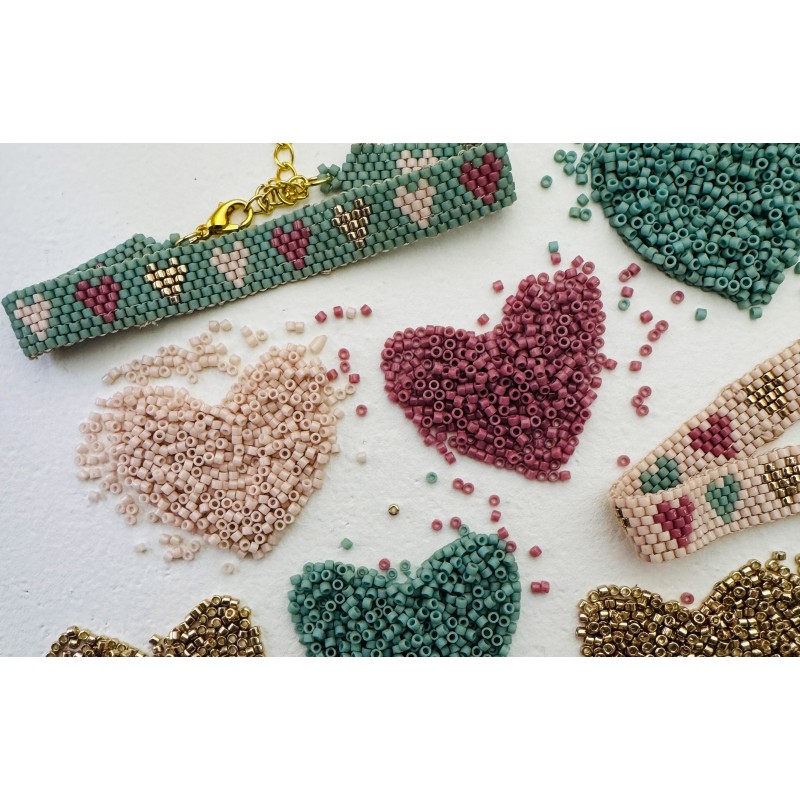 Avec ce kit, vous pouvez créer deux bracelets cœur avec des perles Miyuki Delica 11/0 et la technique du point peyotl.
