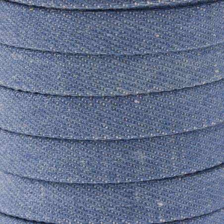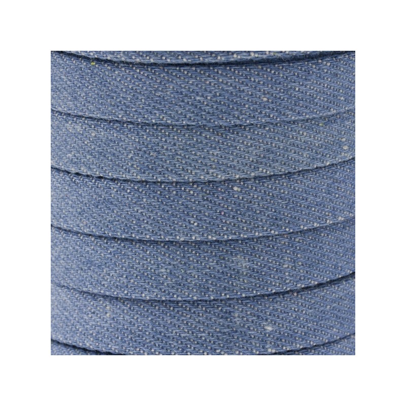 Ruban en denim de 10 mm. Porté en bleu.