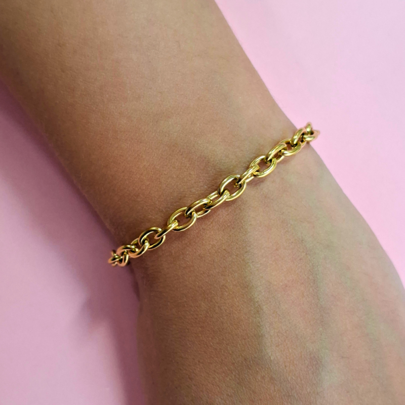 Chaîne forcée ovale de 7 mm de long et 5 mm de large, avec fil de 1,4 mm. Acier inoxydable doré.